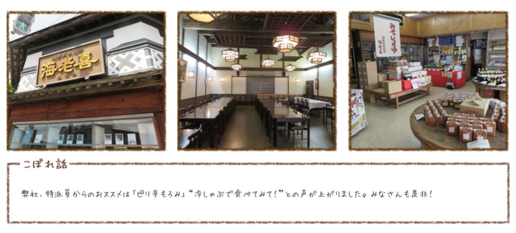 「海老喜商店」かつては日本酒の醸造も行っていたそうです。そんな歴史と伝統は建物が物語っています。