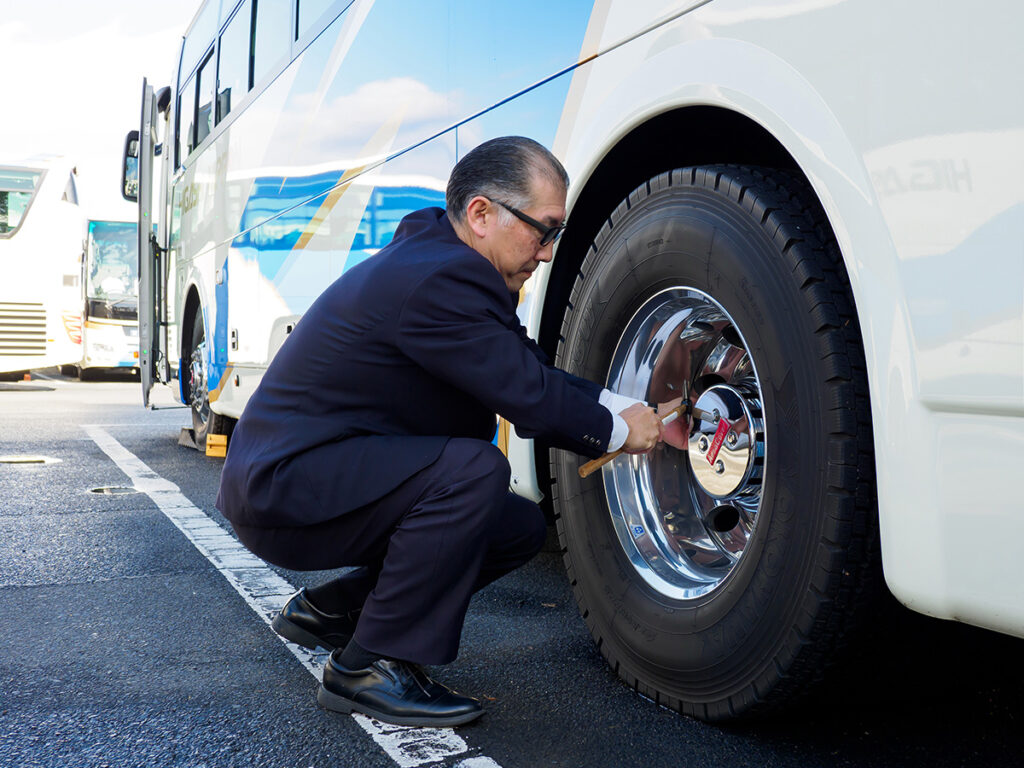当社は、一人の乗務員に対しバス一台を専任で担当しております。そのため、一人一人がバスに対して愛着を持ち、丁寧に掃除・点検・整備を行なっています。ぜひご安心して乗車ください。